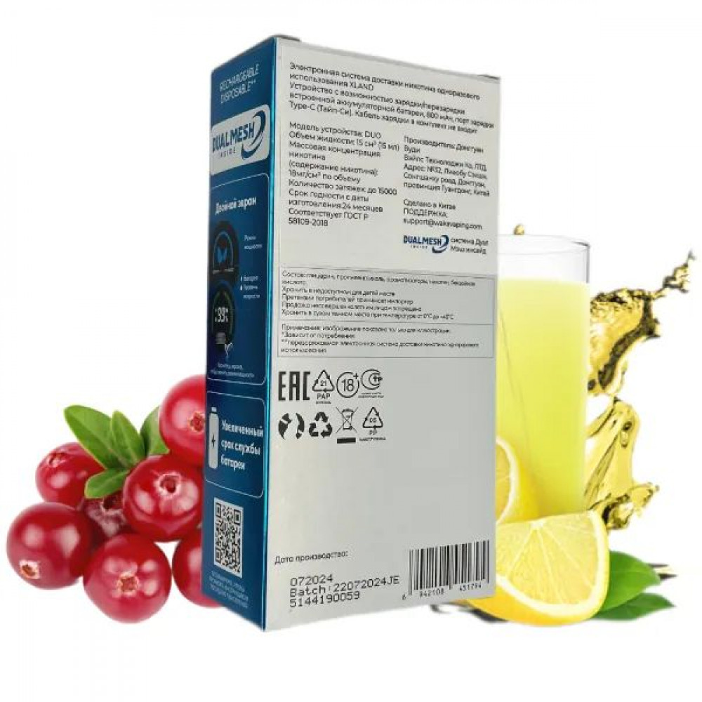 Технические характеристики WAKA XLAND 15000 - Лимонад Кислая Ягода